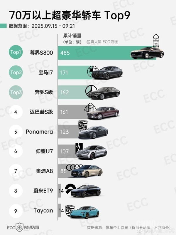 70万以上超豪华轿车周销量TOP9:尊界S800大幅领先
