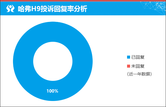 在衡量新车售后服务口碑方面,我们将通过企业对于车主投诉的回复情况进行分析,相对客观地对于新车未来的售后服务口碑有所预判。据车质网数据显示,近一年长城汽车针对哈弗H9的投诉回复率为100%,可见厂家对于车主的诉求十分重视。