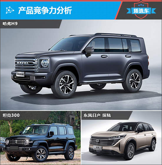 在国内SUV市场中,近两年最火的车型就是坦克300,虽然是长城自家车型,但也对哈弗H9造成不小冲击。而在今年发布的新车中,东风日产探陆的关注度和全新哈弗H9近乎持平。我们就以上述两款车型作为竞争对手,看看全新哈弗H9能否应对。