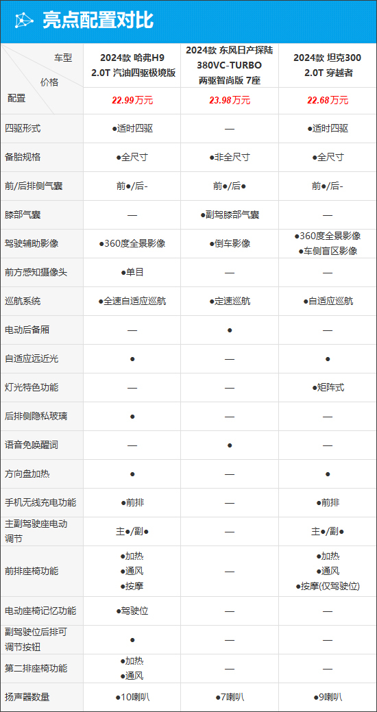 具体到车辆配置层面,我们挑选了售价尽可能相近的车型。配置方面,全新哈弗H9的综合表现取得领先,独享单目前方感知摄像头、后排侧隐私玻璃、驾驶位电动座椅记忆功能、第二排座椅加热/通风功能等,在驾驶功能、舒适性等方面表现优秀。坦克300紧随其后,配备矩阵式大灯、前排座椅加热/通风/按摩(仅驾驶位)等功能。相比之下,东风日产探陆在配置层面表现稍显逊色。