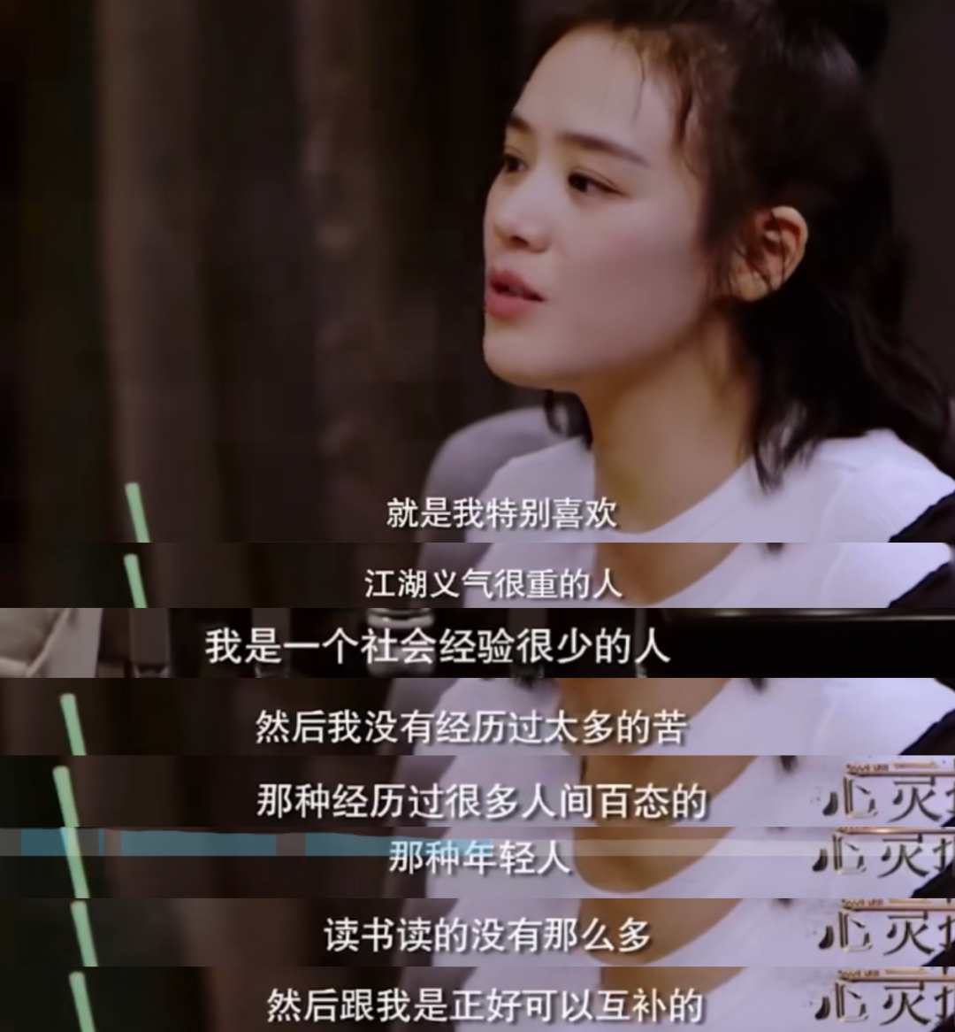 而在选择恋爱对象时,她说:“我的社会经验很少,所以很喜欢江湖气息很重的人,正好互补。”